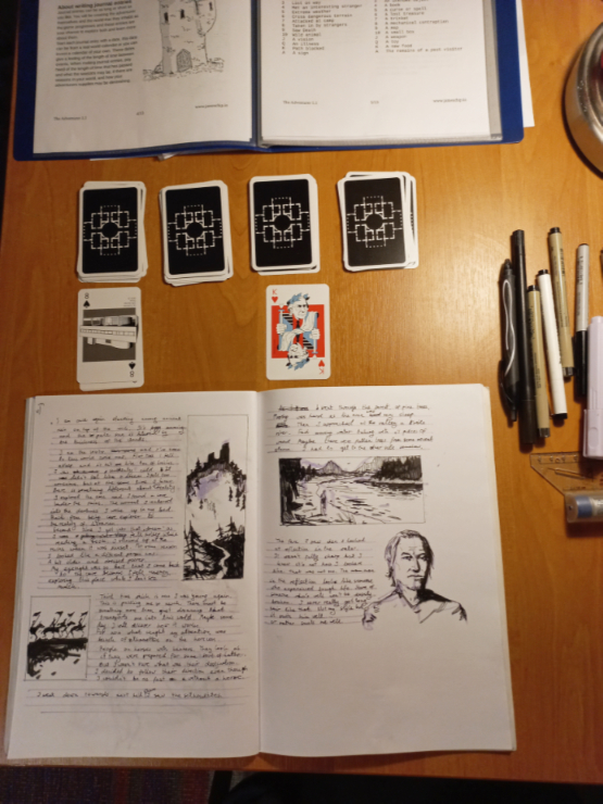 Game play revolves around drawing cards, interpreting their, meaning and then creating a journal entry to document your characters adventure. Cards are divided into four piles by suit, each suit meaning a different thing.